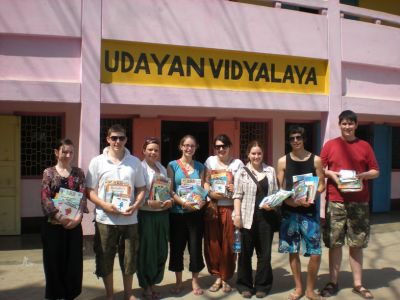 This morning, the children were up at their usual time of 5am, however we were lucky in that we only had to be at breakfast at 7.30am. Some of the group went to help teach in a computer lesson, some of us watched the children learn yoga and the rest of us played cricket. Late morning, we went back into the classrooms, this time ready to hand out the books donated by St Anthony’s Primary School in Slough.